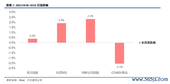 近期中美关系释放一系列缓和信号,特朗普多次表态传达沟通意愿,新一轮经贸磋商正在进行,关注后续APEC会议期间中美元首是否举行会晤。在中美关系有所缓和的影响下,海外市场风险偏好有所修复。本周美元指数上涨0.4%,标普500和纳斯达克指数分别上涨1.9%和2.3%,COMEX黄金价格则下跌2.1%。